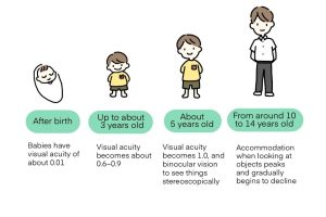 As your body grows, so do your eyes, cornea and lens. As the eyeball grows larger, the axial length also becomes longer, and visual acuity grows to about 1.0 by around the age of 5. The axial length elongates to about 24 mm by the age of 16 and generally does not lengthen thereafter.