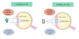 When we look at something close, the ciliary fibers that support the lens, called the ciliary zonule, relax, causing the lens to thicken and focus. However, when the lens hardens due to age-related changes, it becomes unable to focus the image on the retina.