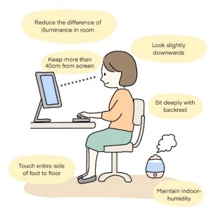 Dryness in the room (air in the room) is another cause of eye problems. Long-time VDT work in an air-conditioned room can easily dry out the eyes, so it’s recommended to humidify the room.