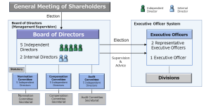 HOYA employs a company with Nomination Committee, etc. management system. Under a company with Nomination Committee, etc. management system, by giving executive officers authority to manage business, business decision making is accelerated. At the same time, three committees—the Nomination Committee, the Compensation Committee, and the Audit Committee—were established, with a majority of the members being independent directors (at HOYA, the committees are composed exclusively of independent directors), to ensure the effectiveness of management supervision by the Board of Directors. Adopting a company with Nomination Committee, etc. management system enables us to clearly separate the execution and supervision of corporate management, whereas this was not possible with the previous company with Auditors system. Through this system, we aim to ensure efficient management and improve the overall soundness and transparency of management.