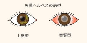 角膜炎が起こる場所によって、角膜ヘルペスは上皮型、実質型、内皮型に分類されます。一般的によく見られるのは上皮型と実質型です。