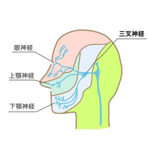 多くの人が、子どもの頃にヘルペスウイルスに感染し、一度感染したら症状が消えてもウイルスは体内に潜伏し続ける性質があります。イラストのように3本にわかれている三叉(さんさ)神経にヘルペスウイルスは潜伏しており、発熱やストレスなどがきっかけで再活性化されると角膜に病巣を作るのです。