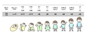 誕生した直後の赤ちゃんは明るさが認識できる程度で生後3か月では遠視状態で、視力は0.01~0.02程度しかありません。成長とともに言葉や運動能力が発達するのと同じように、成長にともなってだんだんと視力も備わっていきます。一般的には、3歳で半数以上の子どもが大人と同じ1.0程度の視力に達します。