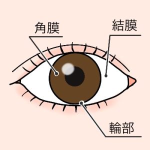角膜は眼球の最も外側にある組織で、一般的には白目と黒目をわけたときの黒目の部分と認識されています。ただし、眼球の奥にある虹彩や瞳孔などの組織が黒く見えているためであり、健康な角膜の色は透明です。