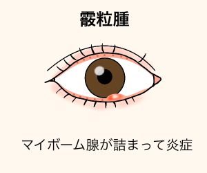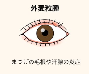 医学的には麦粒腫(ばくりゅうしゅ)と呼ばれ、まつ毛の生え際近くにある脂や汗を分泌する腺やマイボーム腺に細菌が感染して起こる病気です。