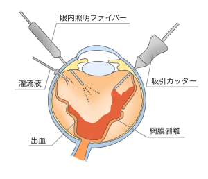 吸引カッターで出血を吸い取ったり、剥がれた網膜を元に戻したりする手術が行われます。