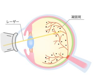 治療では出血の原因となる新生血管を発生させないために、レーザーで網膜の酸素不足になっている箇所を焼くレーザー光凝固術が行われます。