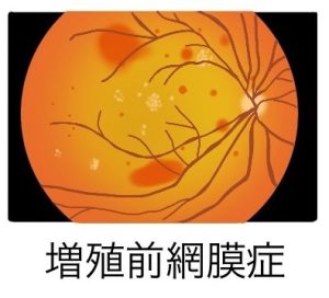 網膜症が進行すると、毛細血管が詰まって、網膜の中に酸素や栄養が行き渡らない部分が出てきます。この状態は増殖前網膜症と呼ばれ、毛細血管は拡張、蛇行など不規則な形を示し始めます。増殖前網膜層の段階でも、網膜の中心にある黄斑に異常がなければ自覚症状はありません。