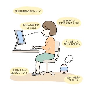 室内の乾燥も眼のトラブルの原因のひとつです。エアコンなどを使用している部屋で、長時間のVDT作業を行うと眼が乾燥しやすくなるため、加湿するとよいでしょう。