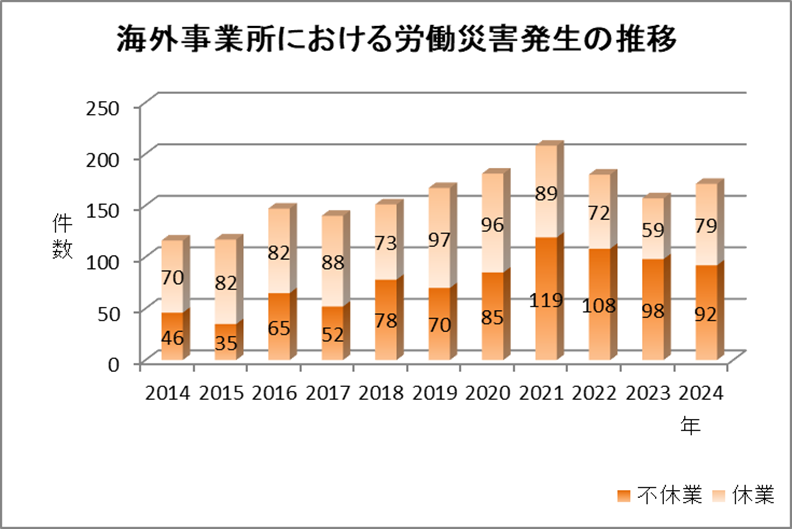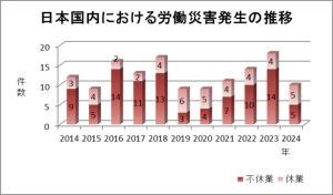 2024年にHOYAグループの日本国内事業所で発生した労働災害は、合計10件。その内、休業災害は5件でした。また、海外事業所で発生した労働災害は、合計171件、休業災害は79件でした。