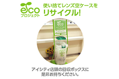 コンタクトレンズの店舗であるアイシティでは使い捨てレンズの空ケースをお客様より回収してリサイクル、有価物化する運動「アイシティecoプロジェクト」を行っており、有価物化による利益を、財団法人日本アイバンク協会に寄付することで、社会貢献活動にもつなげています。