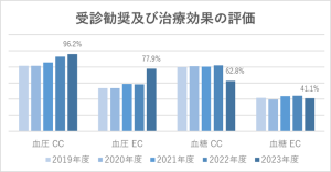 HOYAグループの健康診断実施率は2023年度100%であり、健管理不良者や、要受診者に該当した社員に対して、産業医及び保健師により事後措置(保健指導や受診勧奨)を徹底して行っています。過去5年間の事後措置実施率は100%を維持しています。また、精密検査受診率、管理不良者率や要受診者率などをモニターし、評価・改善に取り組んでいます。この3年は特に、血圧・血糖いずれも管理不良者率は0.22~0.57%と極めて低い値で推移しています。また、Crude coverage (CC:医療サービスが必要な人が適切に医療機関に受診している割合)や、Effectiveness coverage(EC:医療サービスが必要な人が医療機関に受診し、かつ、治療による疾患のコントロールが良好である割合)を評価し、受診勧奨及び治療効果の向上に努めています。