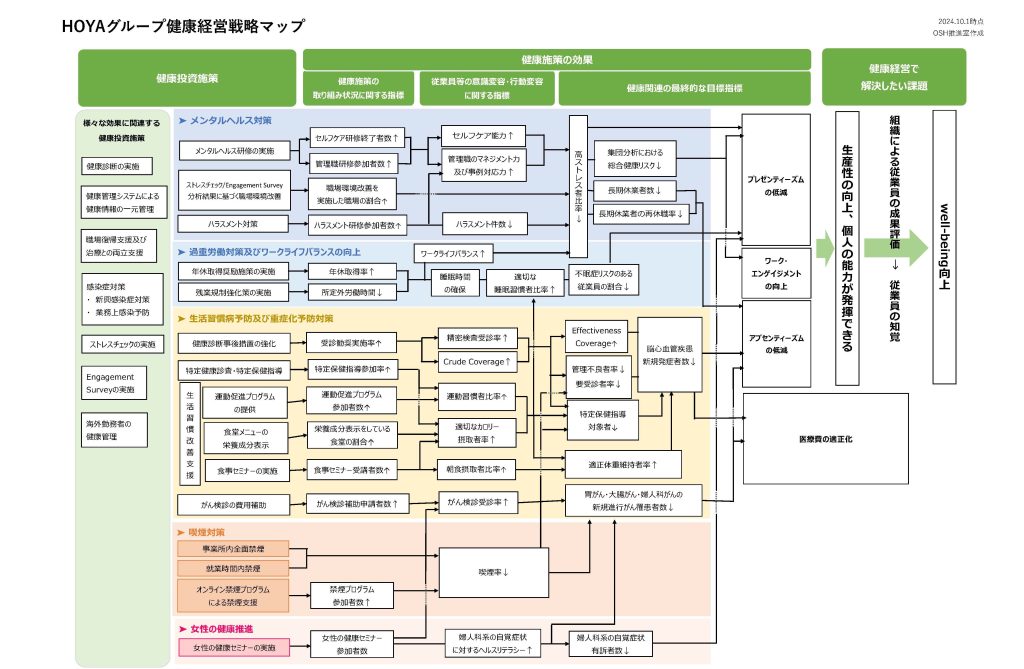 HOYAグループでは、健康経営・健康投資を効果的・効率的に行うために、課題から取組までの結びつきを見える化する「戦略マップ」を作成し、こちらに基づいて健康経営を推し進めています。
