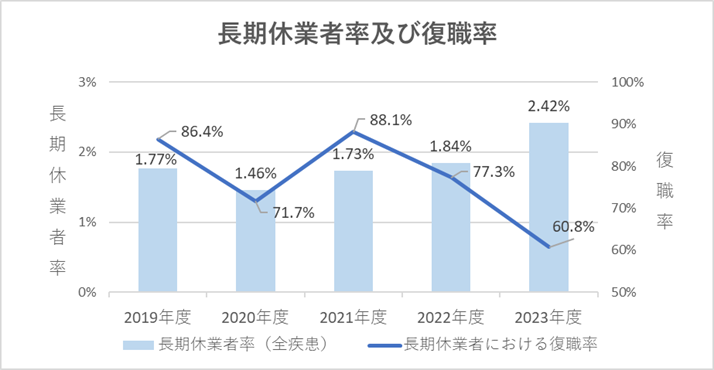 メンタルヘルス不調・身体疾患問わず、疾病を抱える社員が、業務によって疾病を増悪させることなく、「治療と仕事の両立支援」を実施するため、療養中から産業医が定期的に面談を実施し、主治医との連携及び職場上司・人事との連携を行っています。職場復帰の際には、職場復帰可否の判断及び就業上の配慮等について、産業医が助言・指導をし、復職後も通常勤務が可能になるまで定期的にフォローアップを行っています。